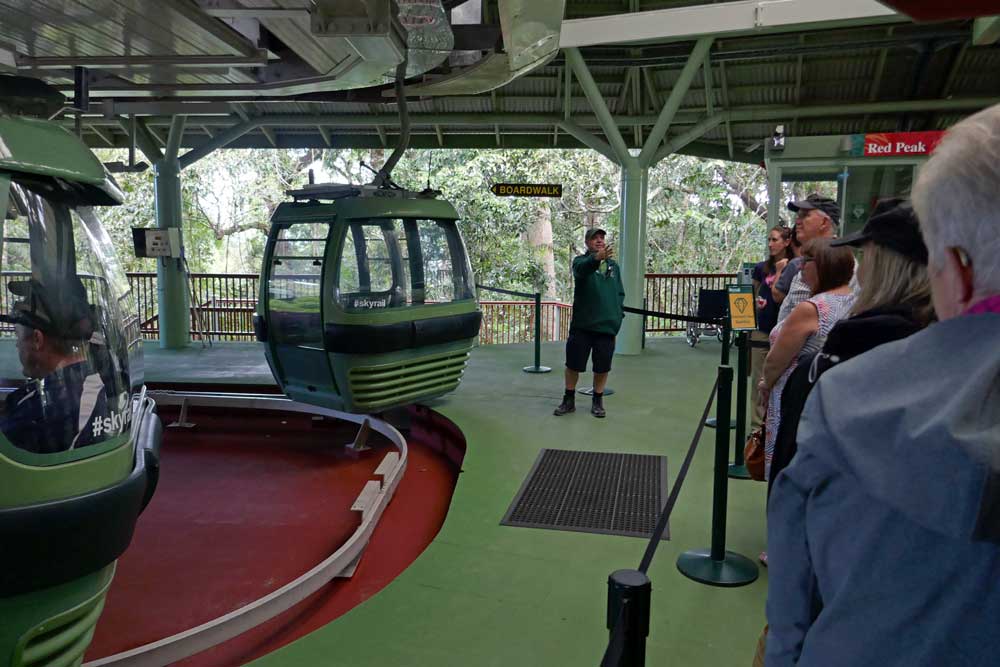 Während man mit der Gondel über den Regenwald gleitet, ist der Blick über das gesamte Gebiet atemberaubend schön. Unterwegs steigt man an zwei Stationen um. Aber keine Angst; nette Helfer sind zur Stelle und geleiten den Fahrgast zur nächsten Gondel. Manchmal gibt es auch einen kleinen Stau und dann heißt es warten (siehe Foto unten).