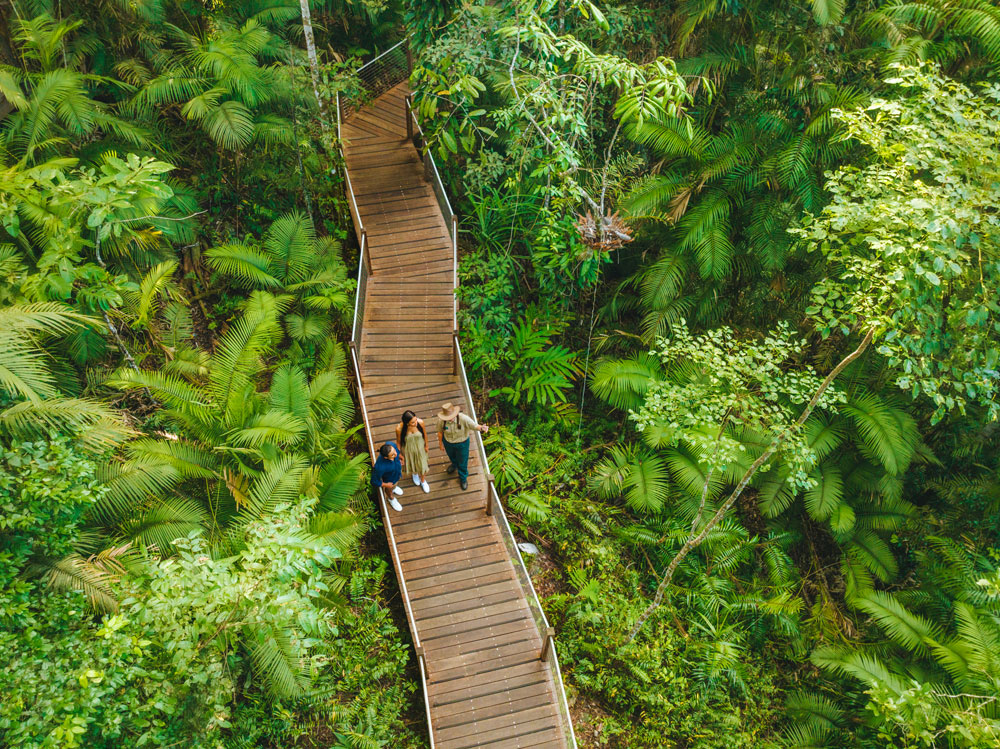 Nach weiteren 15 Minuten Gondelfahrt erreicht man Red Peak Station. Dort kann man verweilen und auf dem 250 m langen "Rainforest Boardwalk Loop" durch den Regenwald laufen. Die außergewöhnliche Vegetation von North Queensland wird jeden begeistern. Besonders empfehlen möchten wir die kostenlosen Rundgänge mit einheimischen Rangern (siehe Foto oben links). Mit ihrer Leidenschaft für Natur, Ökologie, Naturschutz und Landmanagement sowie Wildtierökologie und Ökotourismus geben die Skyrail-Ranger begeistert ihr Wissen über dieses außergewöhnliche Ökosystem, das lange vor den Dinosaurier existiert hat, an Interessierte weiter.