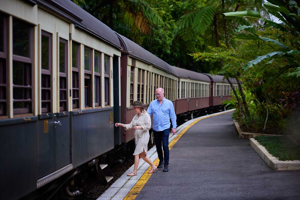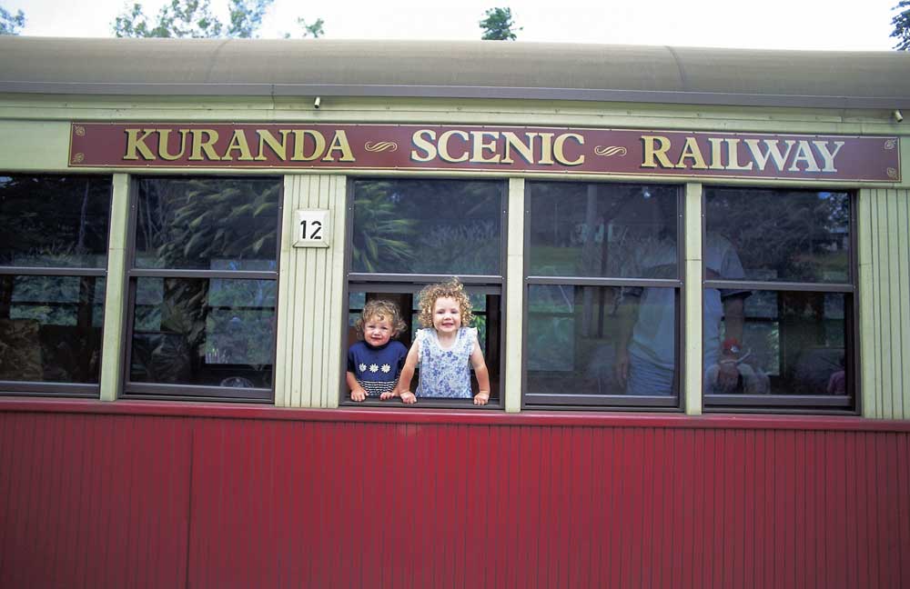 Die schönste und beeindruckendste Möglichkeit, nach Kuranda zu kommen, ist mit der alten Eisenbahn, der Kuranda Scenic Heritage Railway. Die original restaurierten, 100 Jahre alten Waggons bieten den Charme der alten Welt, während sie sich durch Tunnel, über Brücken und Kurven den Berg hinauf schrauben. Unzählige Fotomotive bieten sich auf dem Weg, wobei in der Nähe der Barron Falls sogar ein kurzer Fotostopp eingelegt wird.