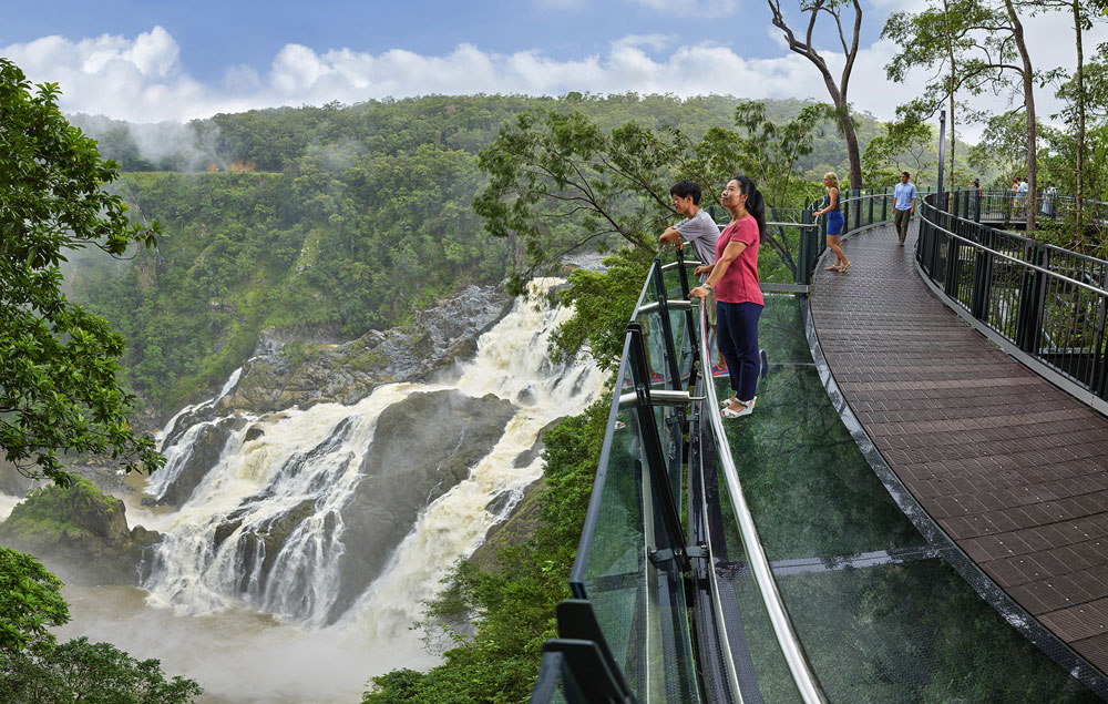 Der erste Stopp ist die Barron Falls Station. Von dort führen Wanderwege durch den Regenwald zu drei Aussichtspunkten, von denen man einen fantastischen Ausblick auf die Barron Gorge und den Wasserfall hat (siehe Foto unten links).