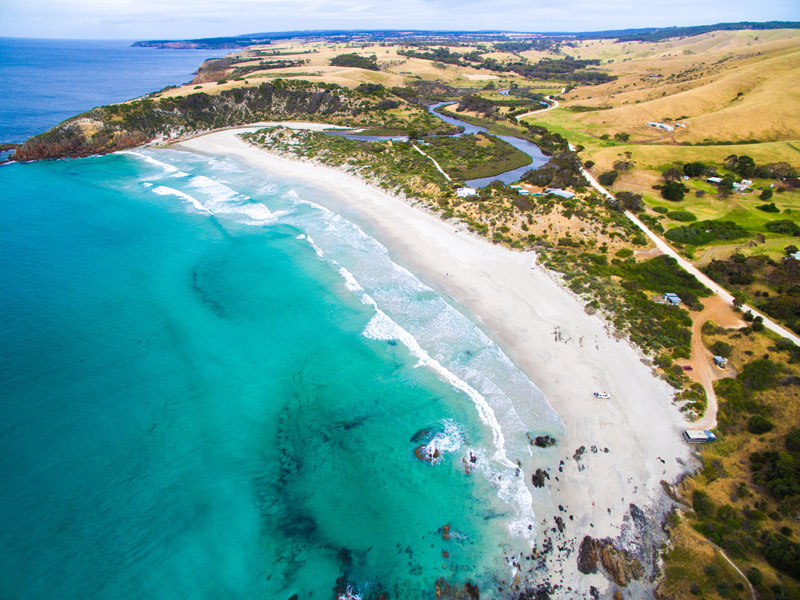 Snelling Beach: Der Strand ist perfekt zum Angeln. Es soll auch die Heimat einer freundlichen Delfine-Familie sein (Foto unten rechts).