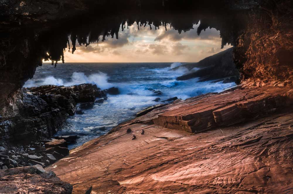 Highlights im Nationalpark sind die Remarkable Rocks (Foto unten links) und der Admirals Arch (Foto unten rechts), Seelöwen, Koalas, Kängurus, und der 1909 errichtete Cape du Couedic Leuchtturm.