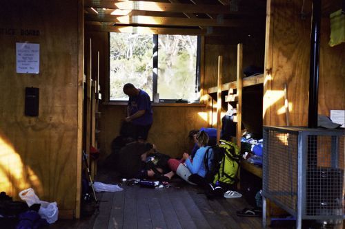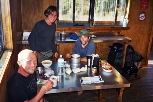 Auf der Hütte selbst sind 2 freiwillige Rangerhelfer. Nur auf dieser Hütte sind sie fest da, um die Wanderer am Anfang des Tracks (80 Prozent der Leute wandern, wie wir, von Nord nach Süd) noch mal einzuweisen, wie man sich zu verhalten hat etc. Auf dem Rest des Tracks sind die Hütten dann normalerweise ohne Ranger. Es sind jedoch ständig Ranger auf dem Track selbst als Wanderer unterwegs, um nach dem Rechten zu schauen.