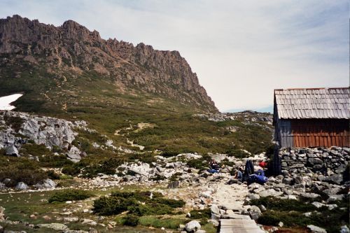 Nach dem Lookout geht es leicht bergab. Langsam klart das Wetter auf und als wir an der "Kitchen Hut", einer Notunterkunft für schlechtes Wetter ankommen, zeigt sich der Cradle Mountain endlich vor blauem Himmel.Wir wandern weiter. Es ist hier immer noch alles voll mit anderen Wanderern, die nur einen Tagesausflug zum Cradle Mountain machen. Wir sind die einzigen mit einem schweren Rucksack, sind aber meistens trotzdem schneller.