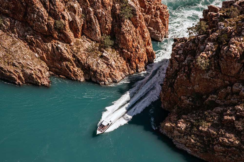 Das Naturspektakel auf der Dampier Peninsula war mit organisierten Touren nicht zu erreichen und mit dem eigenen Geländewagen ebenso wenig. Heute lassen sich die atemberaubenden Wasserfälle, die ja eigentlich gar keine Wasserfälle im üblichen Sinne sind, per Helikopter oder Wasserflugzeug und Schnellboot bestaunen.