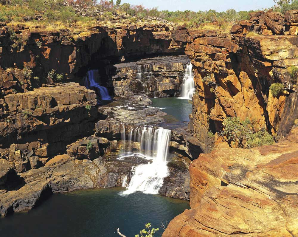 Die Wasserfälle, die den indigenen Wunambal auch als Punamii Uunpuu bekannt sind, wurden vom Wasser des Mitchell River in Sandstein gehauen, wodurch Schichten faszinierender smaragdgrüner Wasserbecken entstanden, aus denen das Wasser von einem zum nächsten stürzt.