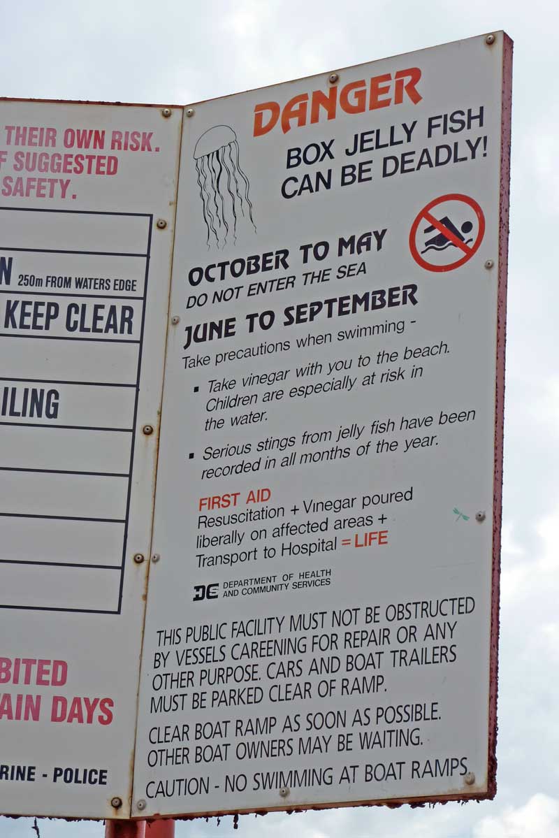 Ist die Gefahr von Irukandji-Quallen jedoch zu groß, werden auch Strände mit einem "Stinger Net" gesperrt. An patrouillierten Stränden geben Rettungsschwimmer auf Schildern tagesaktuelle Auskunft über die Quallenlage (siehe Fotos unten). Falls es trotz allem zu einem Stich kommt, können die Rettungsschwimmer schnell Erste Hilfe leisten.