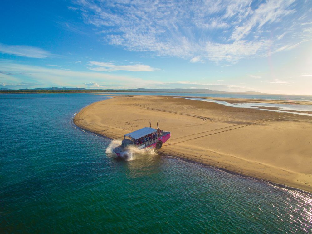 Besuche heute den Nachbarort Agnes Waters und erkunde die atemberaubenden Strände der Umgebung. Der historische Leuchtturm Bustard Head (Foto unten links) von 1868 nördlich der Stadt ist nur per Boot erreichbar. Unternehme daher am besten eine spannende und abwechslungsreiche LARC Tour (optional) mit einem Amphibienfahrzeug (Foto unten rechts).