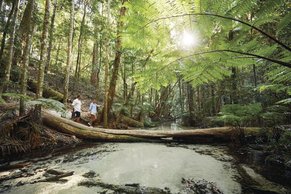 Auf schönen Wanderwegen durch den Regenwald, entlang der kristallklaren Wasser des Wanggoolba Creek, fasziniert die Landschaft mit kontrastreichen Farben seine Besucher.