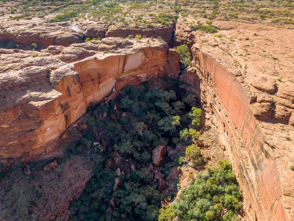 Wer nicht ganz so fit ist, nimmt den einfacheren und kürzeren Weg, den "Creek Bed Walk" (Foto unten links), um das Flussbett des Canyons zusammen mit unserem Guide zu erkunden (1,5 Liter Wasser als "Wegzehrung"!). Im Anschluss und wenn es die Reisekasse hergibt, kann man einen Helikopter-Rundflug über den Canyon (auf eigene Kosten) buchen.